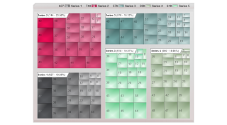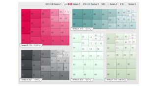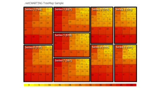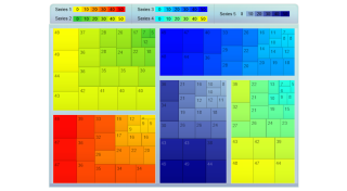 Demonstrates a TreeMap chart where each series uses a different color range to color encode the element values.
