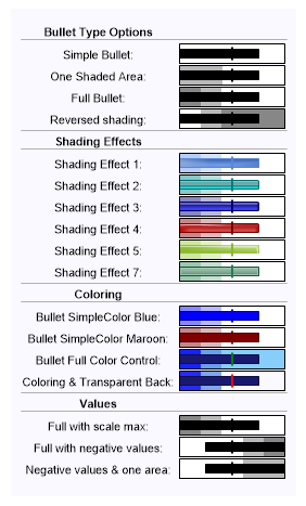 s += "<row>Bullet Full Color Control: <Chart:Bullet values='15,10,4,8' Colors='MidnightBlue,Green,Blue,CornflowerBlue,LightSkyBlue'>";