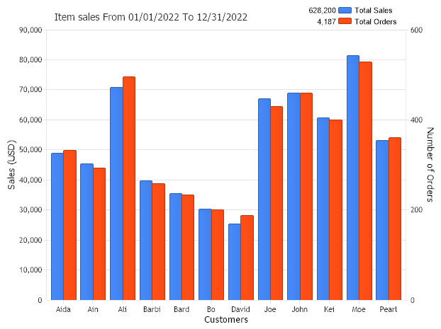 Chart.Series.SqlStatement= "SELECT Orders.Name, Sum(Total) As TotalSale, Sum(1) As TotalOrder FROM Orders WHERE OrderDate >= #STARTDATE# AND OrderDate <= #ENDDATE# GROUP BY Orders.Name ORDER BY Orders.Name"