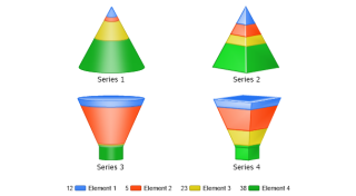 Demonstrates multiple series types in 3D with donut, funnel, pyramid.