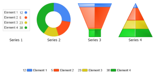 Demonstrates multiple series types in 2D with donut, funnel, pyramid.