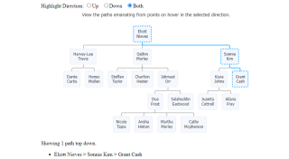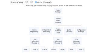 Demonstrates an organizational chart styled to look like a flow chart with interactive hierarchical path highlighting.