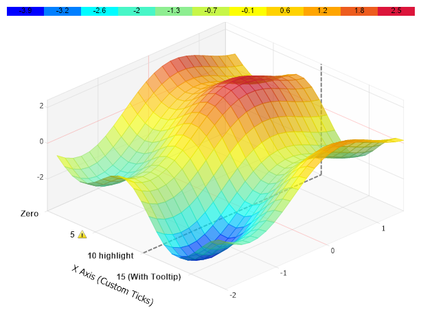 // Demonstrates using custom axis ticks with a 3D surface chart.